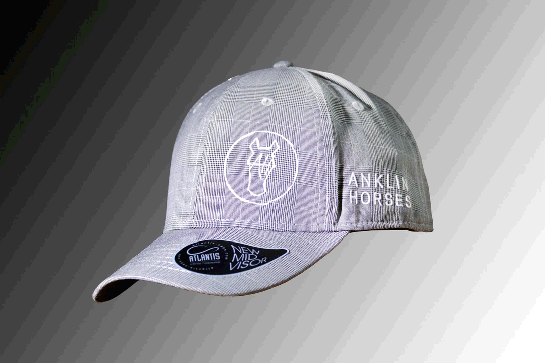 Casquette grise Anklin Horses, panneaux frontaux structurés, fermeture PVC à l’arrière, 6 oeillets cousus, bandeau à fermeture à 4 rangs, dessous de couleur contrastée.