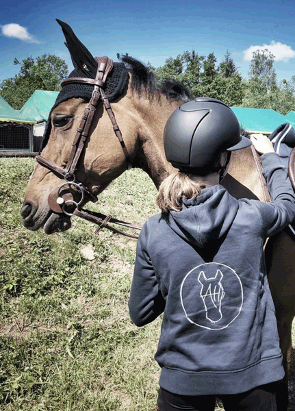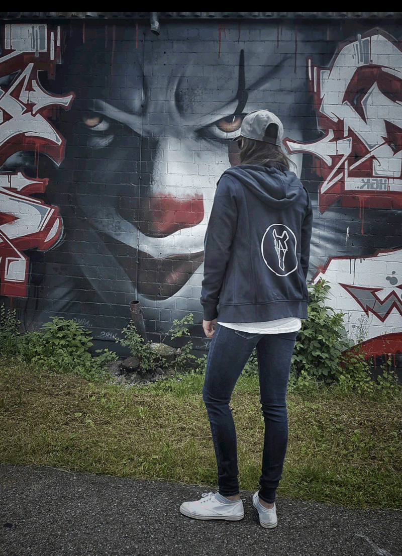 Hoodie bleu marine avec capuchon et zip, poches à fermeture éclair, logo dans le dos et à coeur. Tailles XS, S, M, L