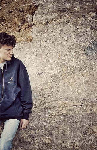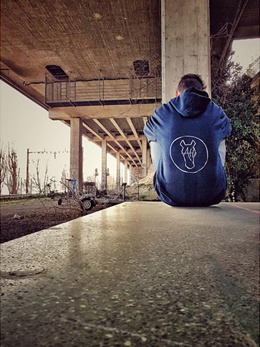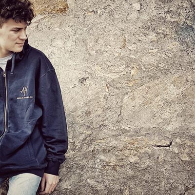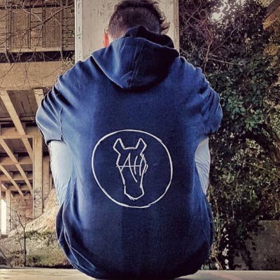Hoodie homme à capuche marine, poches zippées, ouverture zippée à l’avant, logo imprimé au dos.