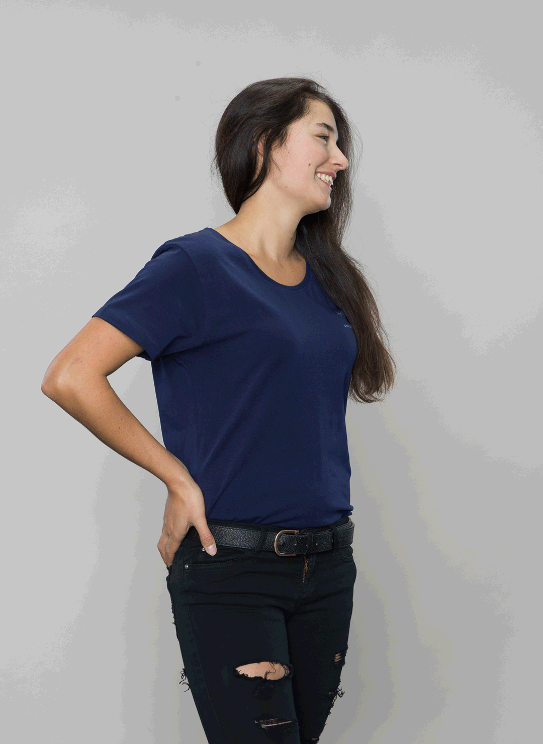 T-shirt bleu, logo à coeur et dans le dos imprimé couleur argent, coton et élasthane, coupe féminine. Le t-shirt est agréable pour le sport, respirant, assez long pour se porter dans le pantalon.