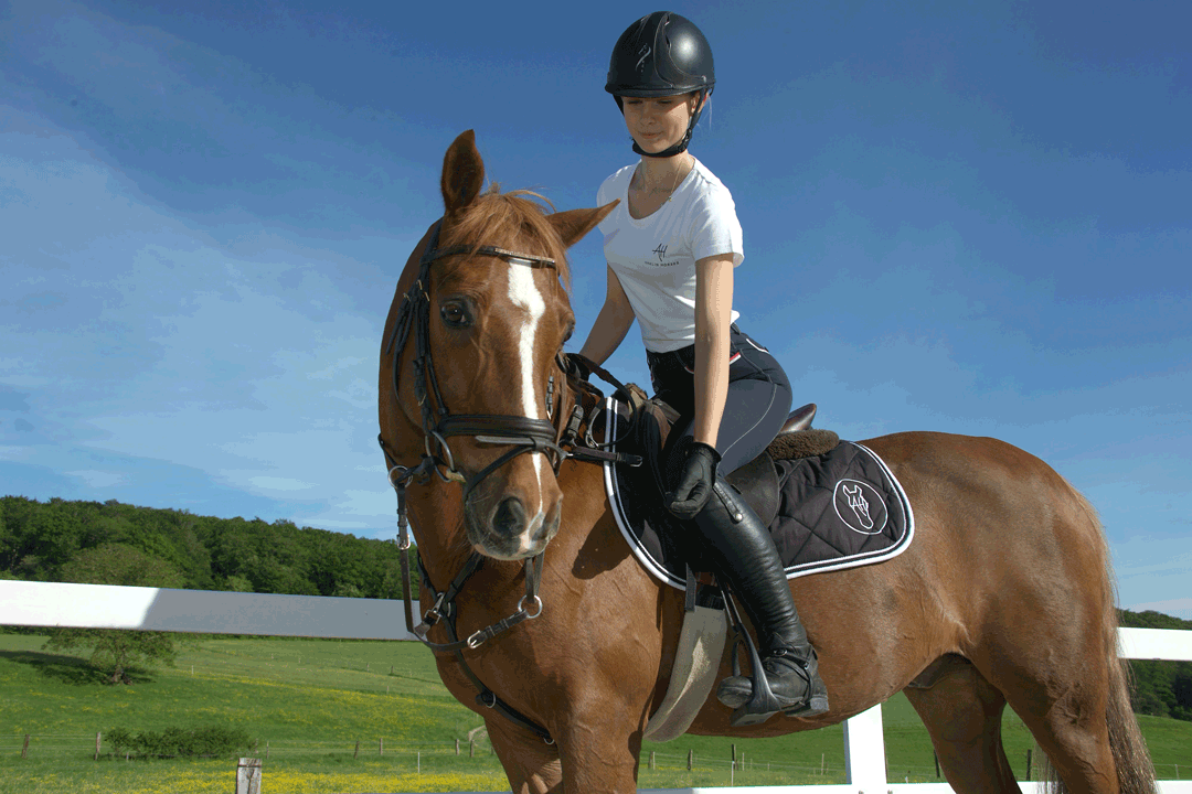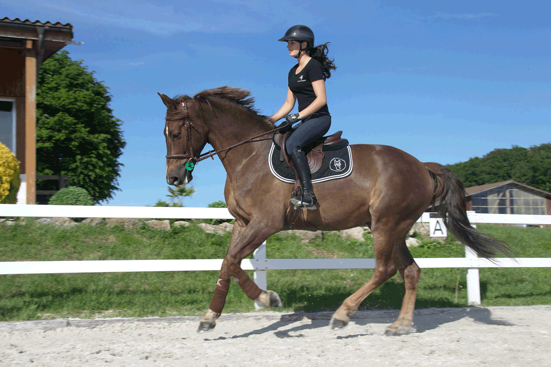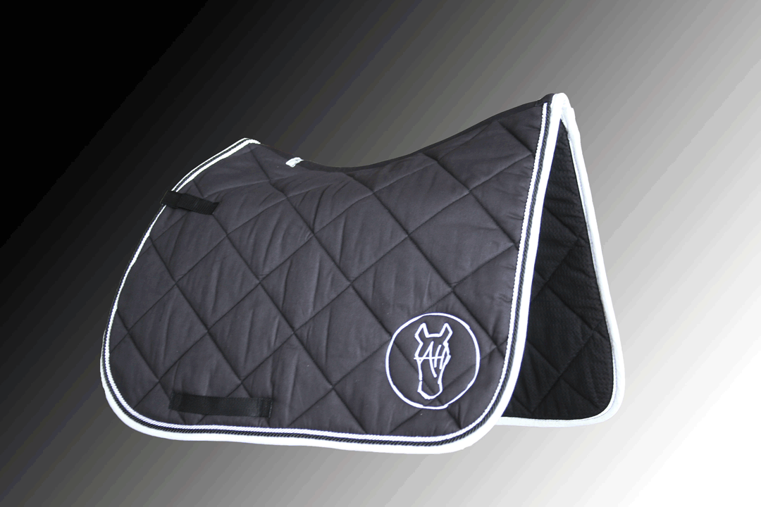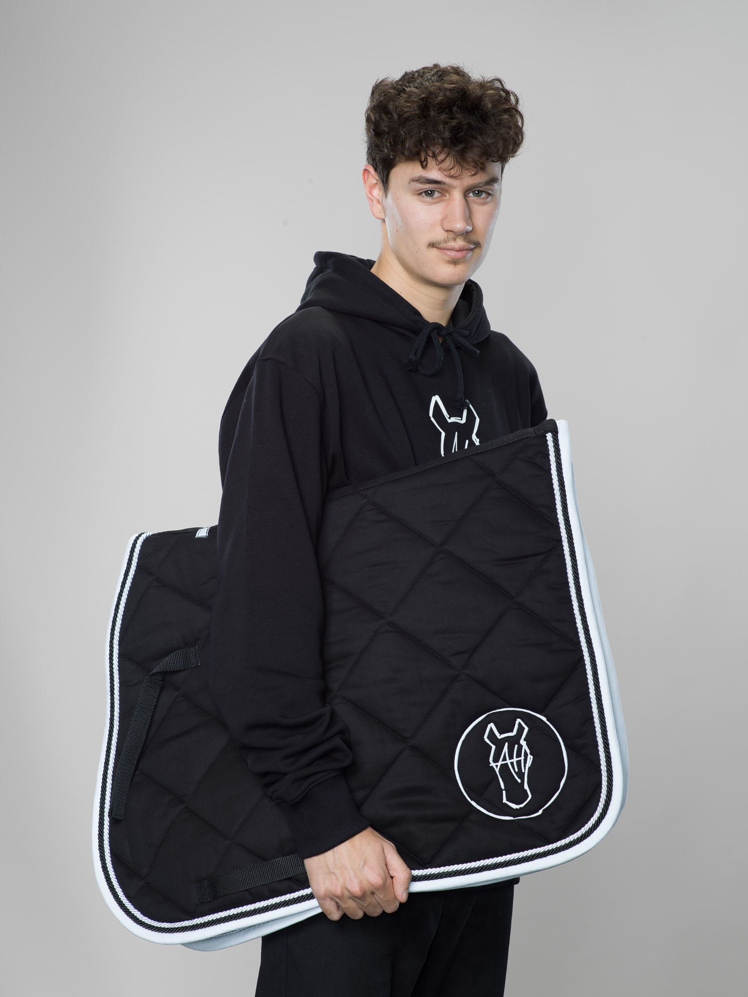 Tapis de selle noir, base HFI, liseré blanc, logo blanc, intérieur nid d’abeille, forme saut