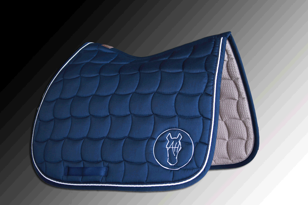 Tapis base Harcour bleu marine, liseré marine et blanc, broderie du logo blanche à gauche, intérieur nid d’abeille, forme saut